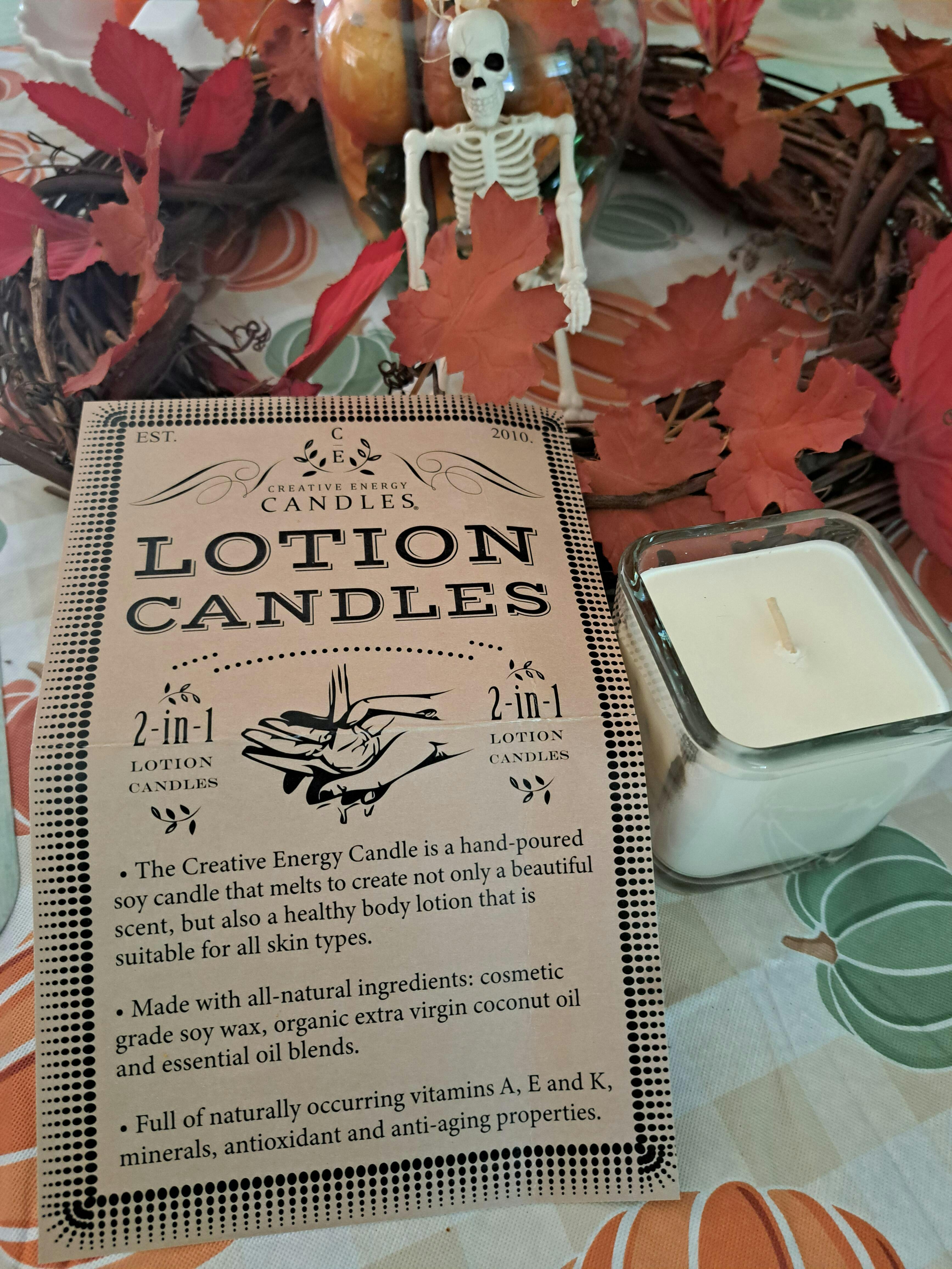 Creative Energy Candles are 2-in-1 candles that, when melted, create both an aromatherapy experience and a warm lotion. The melted "wax" is cosmeticgrade and can be used as a moisturizer on all skin types. The candles burn at a skin-safe temperature, making them suitable for use on the skin.